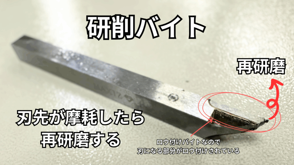 バイト全体が一体構造の工具で、グラインダーなどで刃形を研削して使うタイプです。