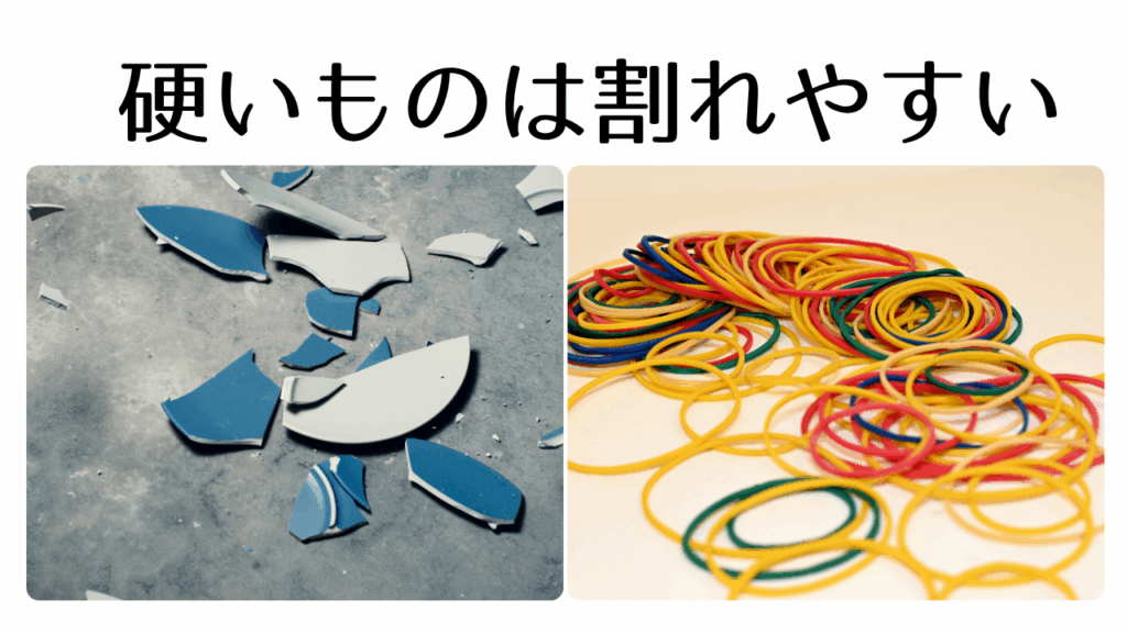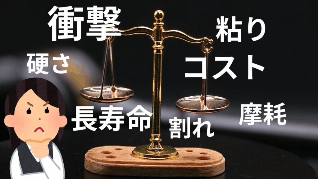 硬度が高い材質は摩耗しにくく寿命が長い一方で、衝撃には弱く割れや欠けが起こりやすいという特性があります。