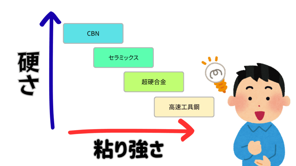 そのため、加工する材料や加工内容に応じて、耐摩耗性と衝撃耐性のバランスを考慮し、さらにコスト面も踏まえて材質を選ぶことが重要です。