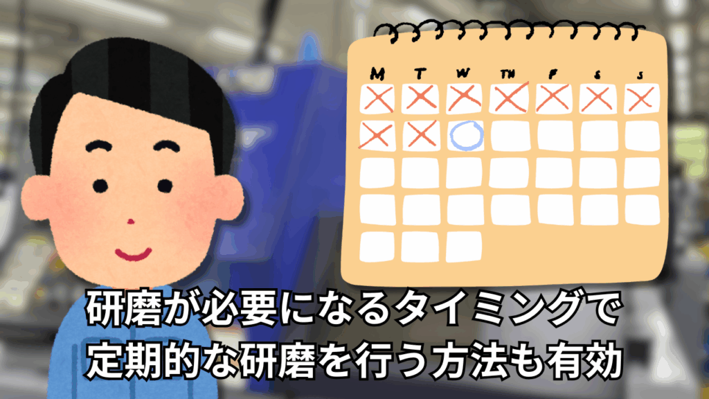 また、あらかじめ加工品毎に研磨が必要になるタイミングを設定しておき、加工品質が落ちる前に定期的な研磨を行う方法も有効です。
