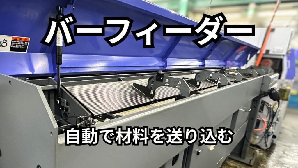 バーフィーダーはその名の通り「バー(棒)」を「フィード(供給)」する装置です。 長い材料をストックすることが出来、その材料を1本ずつ自動で旋盤の主軸(しゅじく)の中に送り込み、後ろから押し出してくれます。