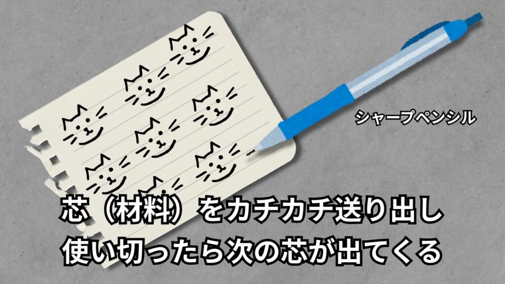 文字を書いて芯が減ってきたらカチカチとノックして新しい芯を出しますよね? そして1本使い切ったら次の新しい芯が自動的に出てきます。