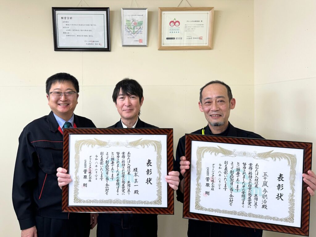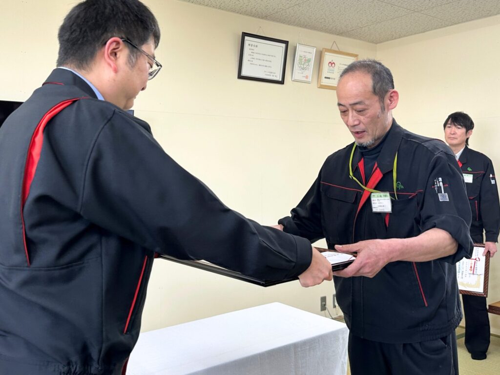 この記念すべき日に合わせて、社内では永年勤続者の表彰式が執り行われました。今回表彰されたのは勤続30年と35年を迎えた2名のベテラン社員です。当社が「不可能を切削する会社。」として日々挑戦し続けられるのも、長きにわたり第一線でグリーンメタルを支えてきてくれたお二人の尽力があったからこそです。これまでの多大なる功労に対し、改めて深く敬意と感謝の意を表します。