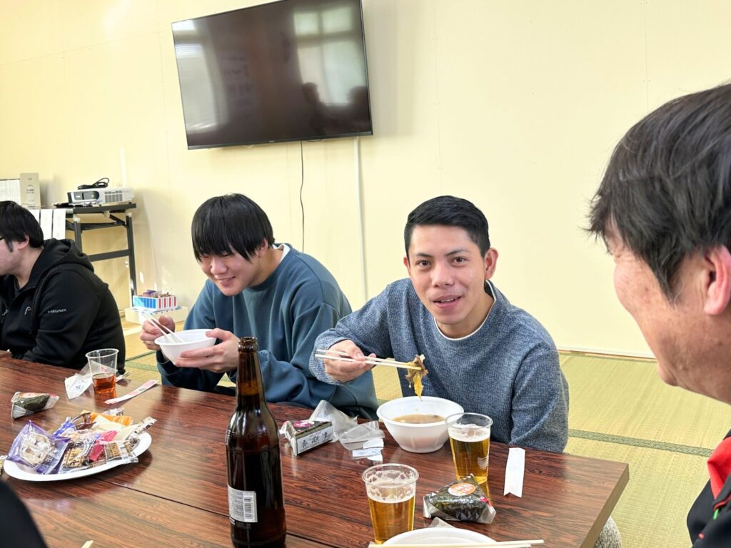 そして、ボウリングで心地よい汗を流した後は、お待ちかねの「クマ鍋の会」です! なんとこのクマ鍋、毎年、会長が時間をかけてじっくりと調理して皆にふるまってくれる特製の一杯です。お肉は驚くほど柔らかく、熊肉特有のクセも無いとても美味しい仕上がりで、社員の胃袋をすっかり掴んで大好評でした。